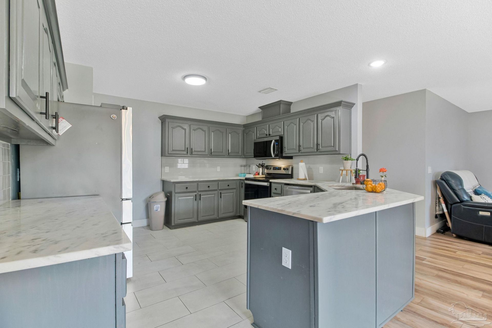 This move-in-ready 4-bedroom home, or 3-bedroom plus office, features a fully remodeled kitchen equipped with granite countertops, stainless steel appliances, a smooth-top stove, and a microwave vent-hood. The interior is complemented by tile in the foyer and bathrooms, custom closet organizers, and 2-inch faux wood blinds. Functional additions include an inside laundry room, five ceiling fans, and a large floored attic with pull-down stairs for extra storage. The exterior offers a 2-car garage, decorative scalloped siding, and an open back patio. Located within walking distance to public boat launch and park.